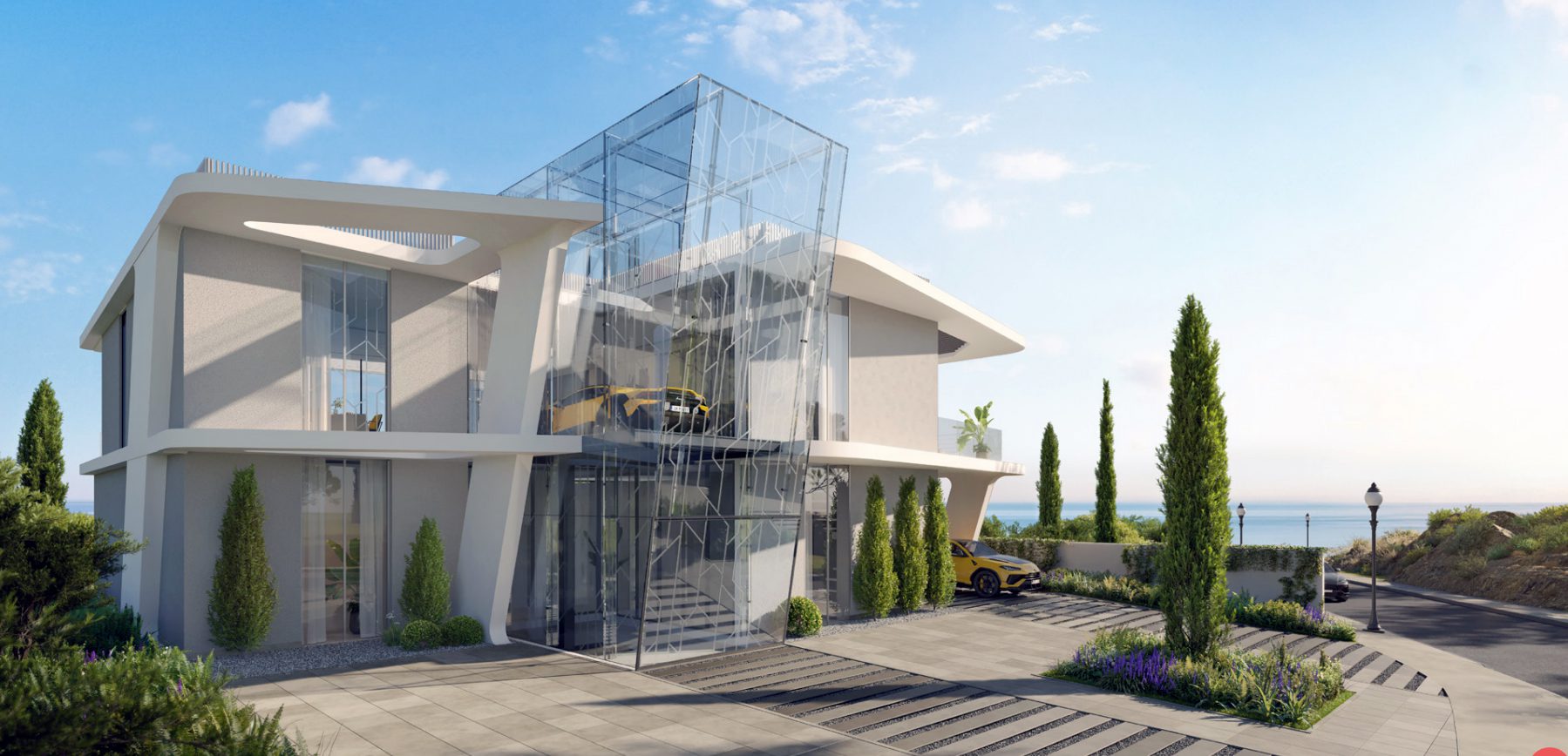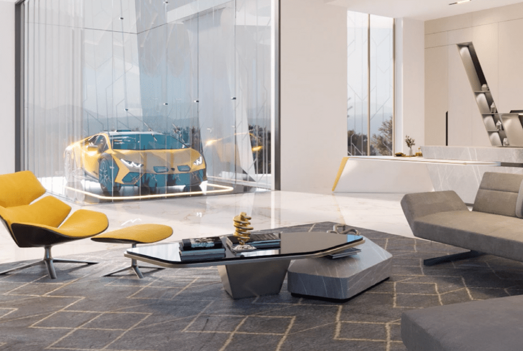 | Painite Villa – One of One Edition | Price on Enquiry | Sky Car Lift, glass car display, panoramic sea views, Lamborghini interiors |
