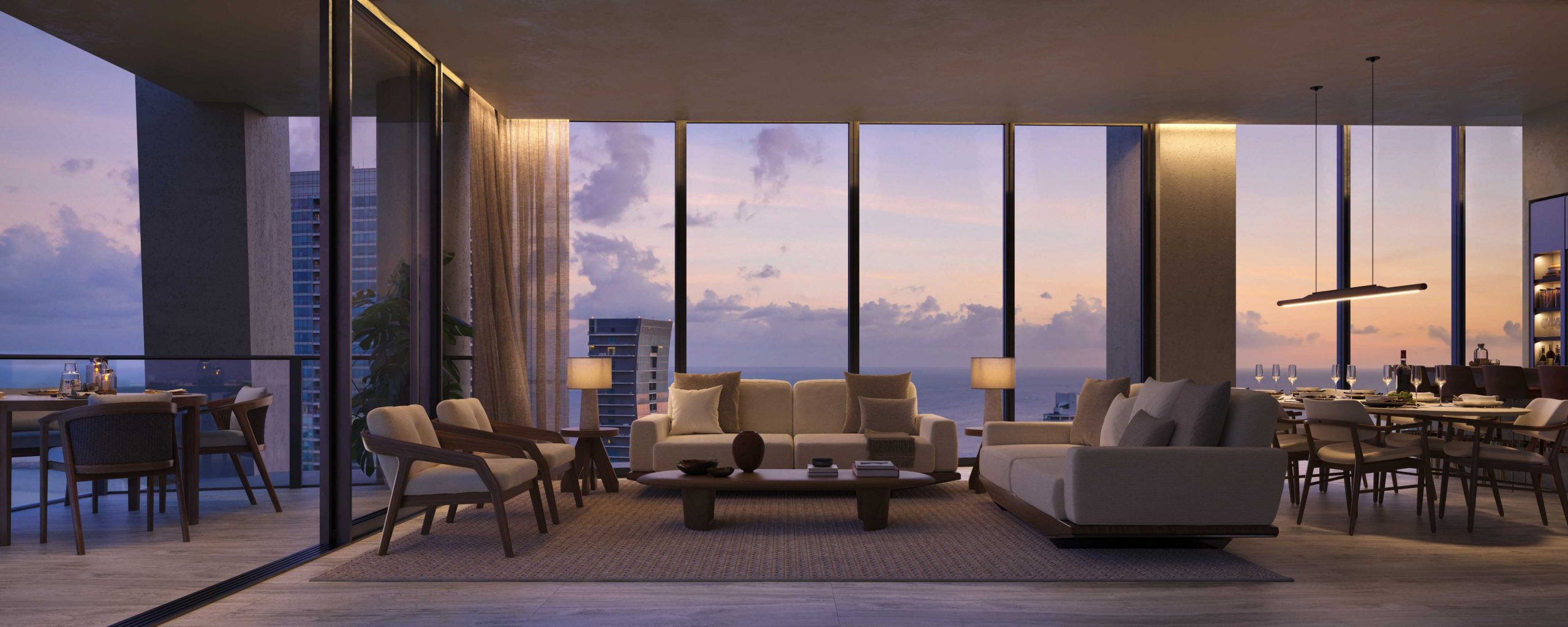 Inside, fully furnished residences range from elegant studios to expansive four-bedroom homes, each finished with refined interiors, smart-home technology, and panoramic views of the Miami skyline and Biscayne Bay. The design emphasizes light, space, and seamless indoor-outdoor living, creating an atmosphere of contemporary luxury.